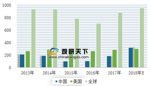 2013-2018年E全球、美國與中國工程機械市場規(guī)模對比(單位:億美元)