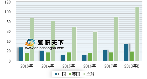 2013-2018年E全球、美國與中國工程機械銷量對比(單位:萬臺)