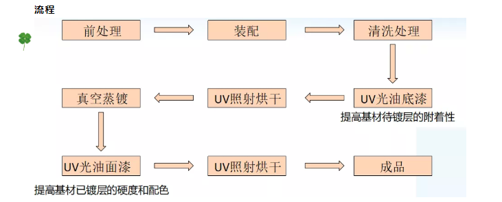 真空蒸鍍有三層:底漆層(6~12um)+鍍膜層(1~2um)+面漆層(10um),將基材表面雜質(zhì)、灰塵等用布擦拭干凈,提高噴射良率。將基材裝配在專用掛具上,用以固定于流水線上,并按設(shè)計要求實現(xiàn)外觀和功能的遮鍍。由于基材是塑膠件,在注塑時候會殘留空氣泡,有機氣體,塑膠表面不夠平整,直接蒸鍍吸附差且不光滑平整,涂一層底漆會提高鍍層的附著性且表面光滑平整效果好。將掛件裝配于真空容器內(nèi),加熱,實現(xiàn)蒸鍍。